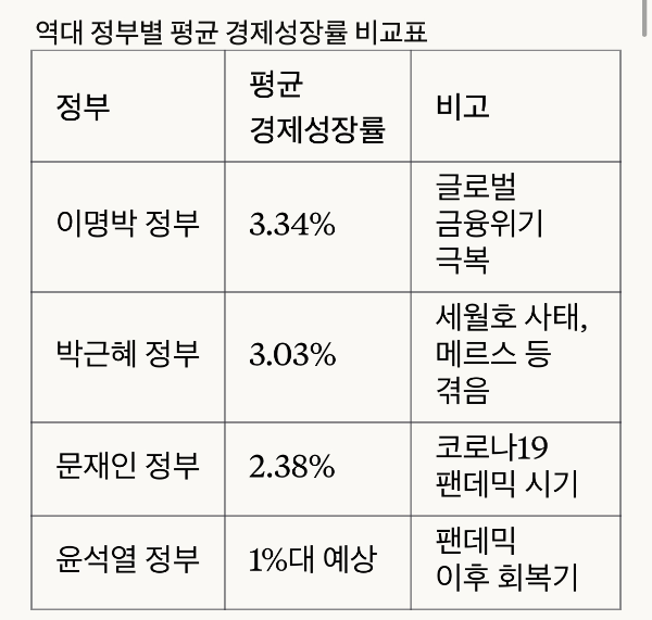 윤석열 정부의 경제 성장률은 정확한 산출이 어렵지만, 대체로 1%대 성장을 기록할 것으로 전망됩니다. 이는 과거 이명박 정부(3.34%), 박근혜 정부(3.03%)는 물론이고, 코로나19 팬데믹으로 전 세계 경제가 휘청거렸던 문재인 정부(2.38%)보다도 훨씬 낮은 수준입니다.